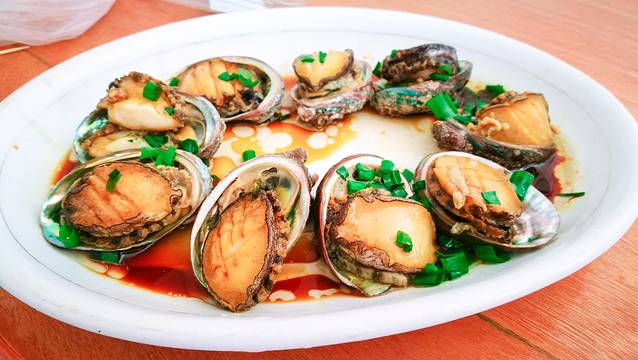 今日天气大好,艳阳高照,从老板娘处取得回程船票,回程是15:30,高速轮。一番商量,打算去镇上逛逛。一帮人坐着k003到镇上,到菜场兜了一圈,入手9个鲍鱼(5元/只)、4个螃蟹(2有膏80元/斤,2无膏50元/斤)、毛蚶略干,打算中午叫饭店代为蒸煮。之后就打算回去了。路上遇药店,进去买了一盒晕船贴,以备不时之需。