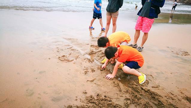 由于司机不能及时来接我们,正逢码头边上有个不收费的小沙滩,三娃总要去玩玩沙,所以一边等司机来,一边三娃就开始玩沙了。