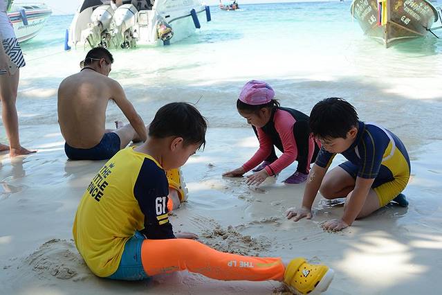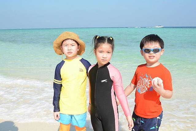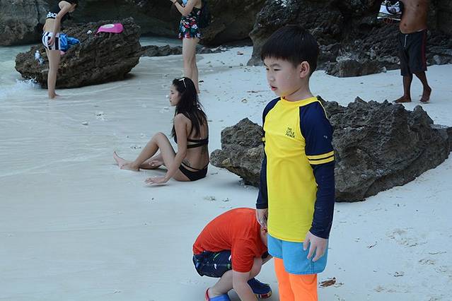 MONKEY BAY上全是猴子,11年前凡妈也仅仅是远远观望了一下,这次是近身接触啊!有些胆子大的游客,和猴子拍照,猴子们也胆大,直接爬到游客头上,引得游客阵阵惊呼!另外还有人抱着一条蜥蜴,5B合影一次,凡妈想着不久前普吉的蛇吻女游客的戏码,立即阻止了凡爸让凡童鞋和蜥蜴合影的念头。一群人坐在沙滩上,看着娃们在水里扑腾,凡妈是想着法来平复自己翻腾的胃。除了凡爸和另外一个小伙伴(原本他们打算深潜的),其他人都没了浮潜的欲望,所以在MONKEY BAY呆到15:00,我们就打道回府了。这时船上已经准备好了水果,同时船员们拿出一个小费桶,上面标了100b,凡爸更是搞笑的以为这是给他吐西瓜籽的果壳桶。我们一共给了300b的小费,是不是有点坑啊!