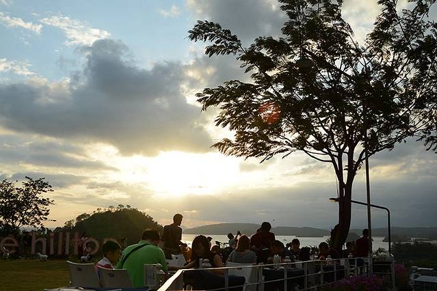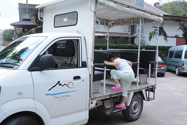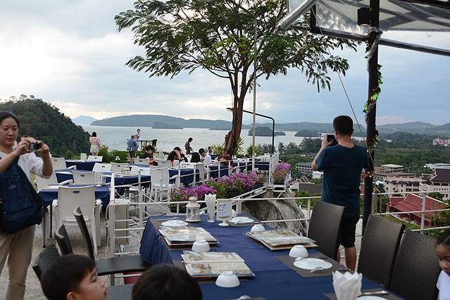 凡妈提前一周EMAIL预约了当天晚上的THE HILLTOP晚餐,定了17:30来接人。很准时, THE HILLTOP的高尔夫车到达酒店门口,一行11人正好坐满。虽然THE HILLTOP离酒店很近,但我们发现靠双腿一路爬上山还是挺累的,好在有车接送啊!到了山顶,眼前的景色还是蛮震撼的,由于提前预定了,所以帮我们安排了景观位,坐在那里吃着饭,看着日落,还是相当不错的。不过大家总结:这顿吃的主要是景色,不是菜。反倒是凡童鞋,觉得这里的菠萝炒饭是他唯一能接受的。这顿饭,结账是6385B,含服务费,价格还算可以,不贵。