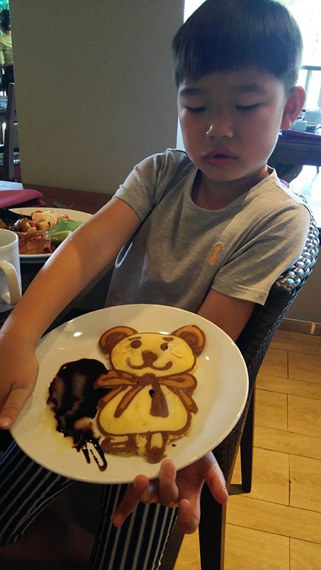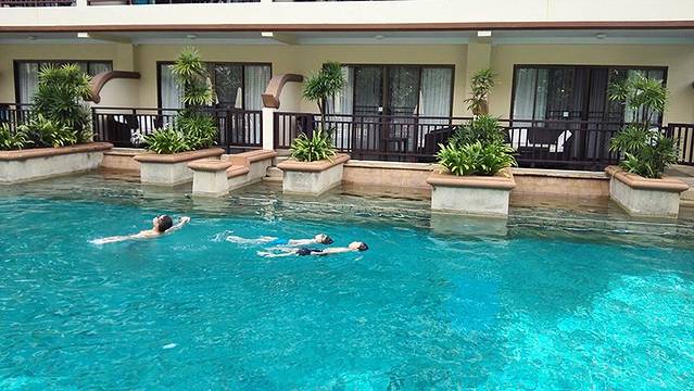 叫醒凡爸和凡童鞋,到餐厅吃早餐去了!碰到了之前同伴说的那个黑龙江mm服务员。早餐还算丰富,主要Dusit Thani早餐很符合凡童鞋的胃口,有他大爱的炼乳和nutella巧克力酱。另外还有面、粥、油条,水果也蛮丰富的。饱饱的吃了一顿后,凡童鞋又迫不及待地拖着凡妈回房间换泳衣了。找了个草坪上的位置,要了2块浴巾,凡童鞋就跳进了泳池,这一跳,就整整在池子里呆了一天啊!