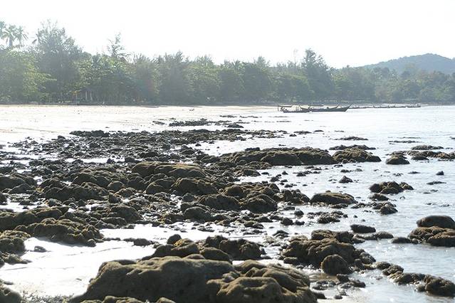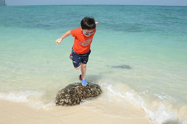 凡爸和前台商量了一下,同意我们延迟到下午2点退房。好了,吃完早餐,凡童鞋依然跳进泳池,凡爸依然玩他在甲米的最后一次皮划艇,凡妈依然躺在沙滩椅上吃龙眼。期间,凡妈带着凡又去了次海边,因为凡妈突然想去,有珊瑚礁的地方一定会有鱼,那么酒店沙滩上的珊瑚礁在海水淹过后,一定也会有鱼的。果然,单单站海里就看到一群群鱼围着珊瑚礁游,还看到一条长的像带鱼,但不是带鱼的鱼。
