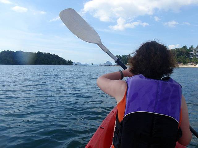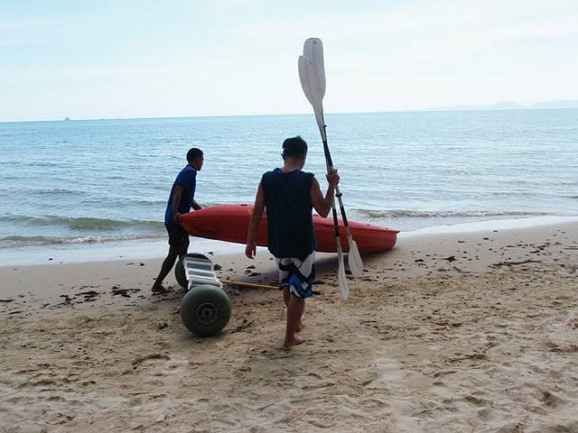 酒店免费租用皮划艇。初玩皮划艇,凡妈难免有点抖划,心里吓丝丝的,一直在祈求千万不能翻船啊!和凡爸玩了大概30分钟,在凡妈的不断催促下,终于回到了海滩上,凡妈的心也就定了。