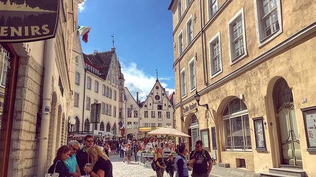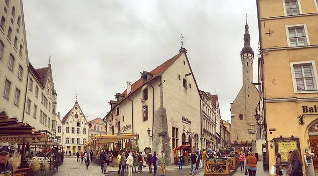 放下行李,去老城的中心广场的餐厅吃饭。我们住在老城里,离中心广场几分钟步行。天气时阴时雨时晴。游客们兴致勃勃,到处是人,几乎人挤人。午饭点了一个海鲜拼盘,一个炸面包条和一盘蔬菜沙拉,三杯橙汁。东西不多,100欧元。这是爱沙尼亚塔林的消费水平,可参考。