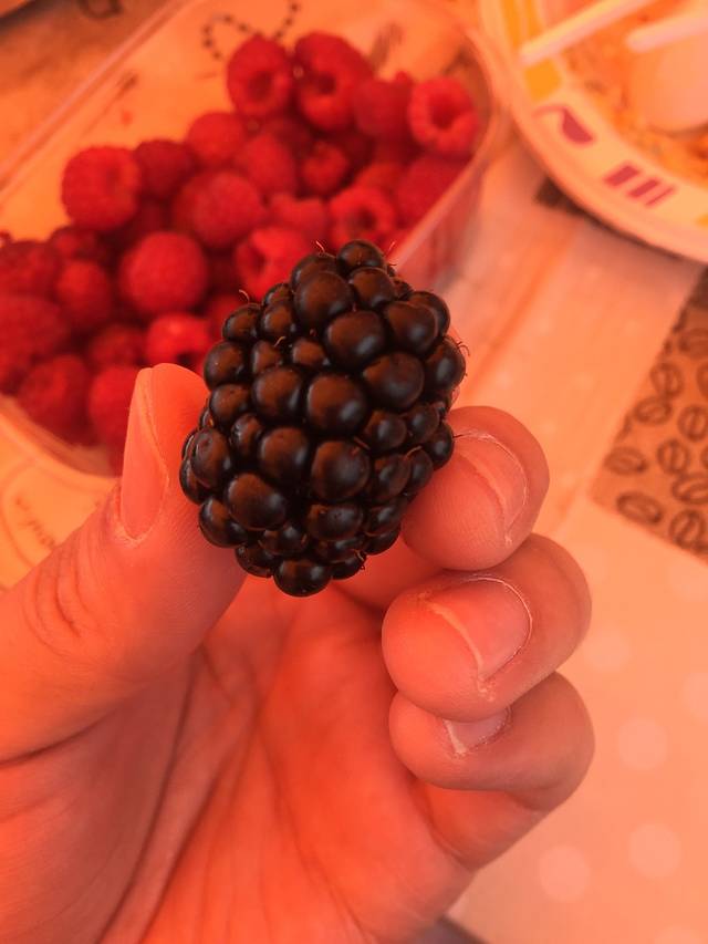 我们买了些大樱桃、树莓、蓝莓,和蛋大的桑葚,炸鱼、烤鱼、时蔬,就着冰啤填了个饱。
