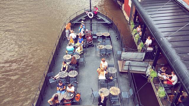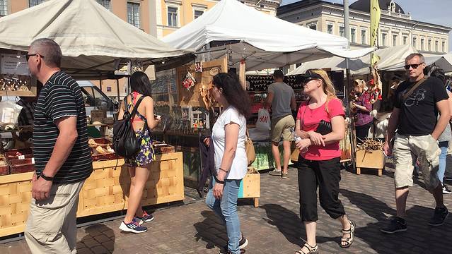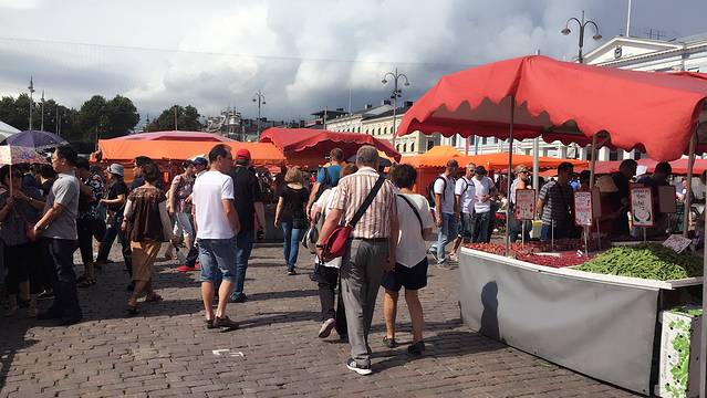 我们住在城市西南角,出行路线沿着城市南端海岸线向东走,经过了一些民宅、商业区。在岸边的餐厅喝了杯啤酒,冰激凌。于中午抵达城市东南角的广场集市。听说这里有卖各种小纪念品、新鲜水果和炸鱼,是赫尔辛基必到景点之一。喜欢小物件的女人,挪不动腿,看这个看那个。摊主无论老少,都能讲流利的英语,调侃、讨价还价无障碍。