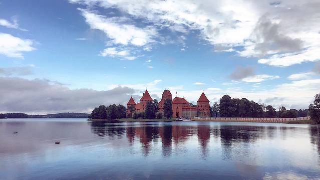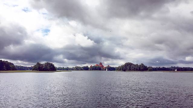 出发,开车半个多小时去梦幻之地特拉盖!一个分布着很多自然湖泊的城外仙境,或者说一个被不规则的道路切割了的大湖。下车后,她先去交停车费,立陶宛的停车规则,先在机器上交费,把小票放在车窗里再离开。她让我蒙上眼,跟她走10米再睁开。我在小路上照做了,睁开眼的那一刻,就是我梦中的湖中城堡,没想到它那么近,那么突然……