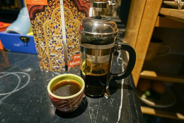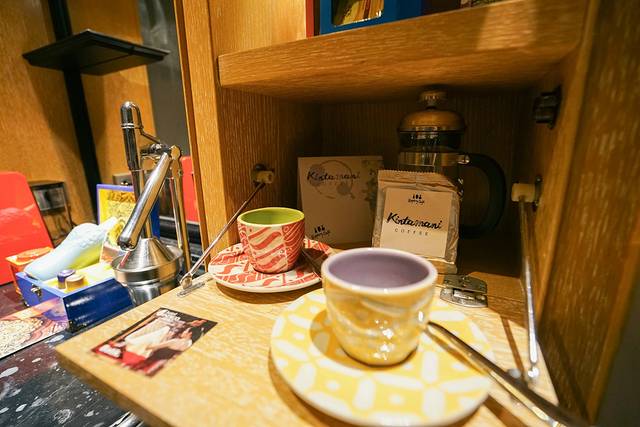 除了小杯子,房间里还专门准备了手冲咖啡的法兰壶和咖啡豆。