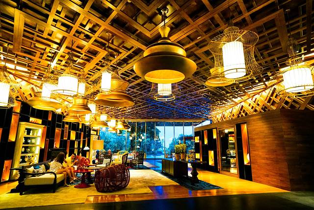 白天灯光不亮的时候,还真没仔细注意过这个吊顶。在入口和树冠上装饰度假村的标志性的几何线,其实也是从传统巴厘织造布上吸取的灵感。