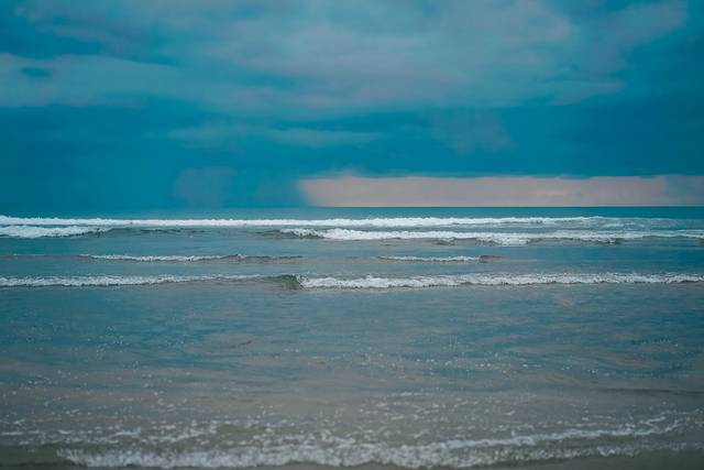 多云的天气,它躲进厚厚的云层里,没有了金色的反光,大海是天空的颜色。