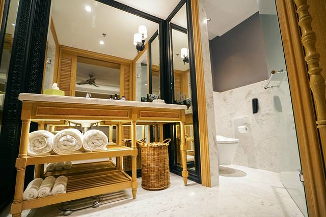 卫浴是大理石的地板和墙面,垃圾桶竟然是竹编的小篮子,看起来像件艺术品,还真有点舍不得扔垃圾呢。