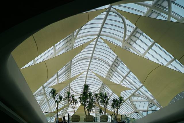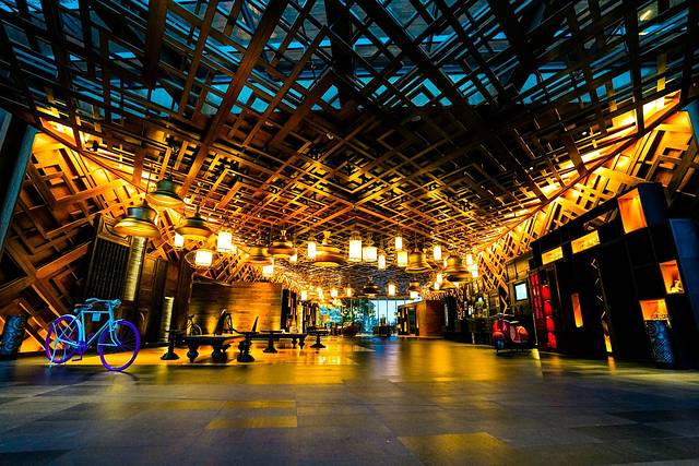 华灯初上,抵达迎客的大堂之后,看到了更加灿烂的灯火。着实被独特新颖的造型和光影惊艳了一把,没看到日落的遗憾一扫而空,忍不住拿出相机开始拍拍拍。