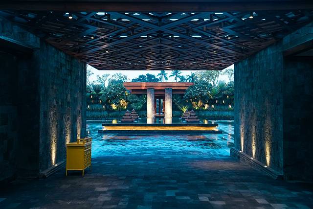 高台上的灯火倒影在积雨的地面上,星星点点,十分契合巴厘岛万物有灵的氛围。