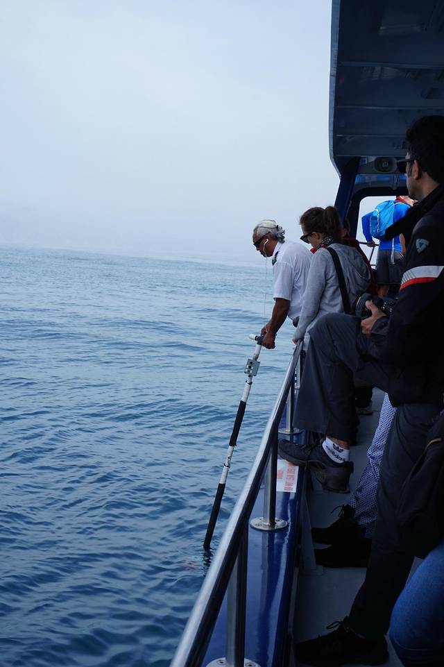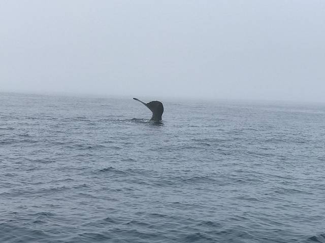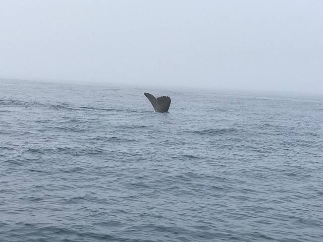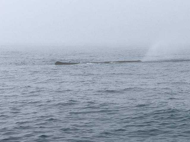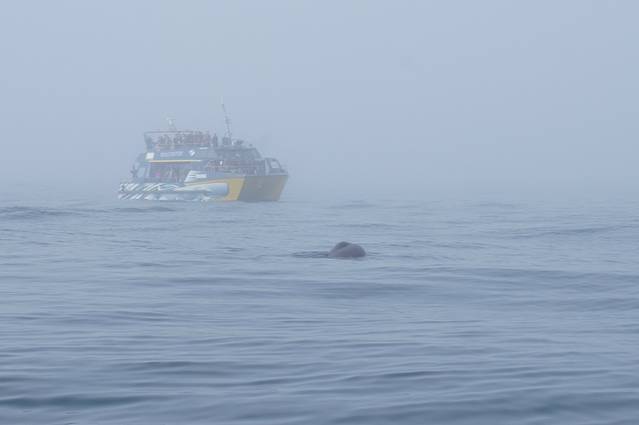 这是观鲸的船,都是一样大小的。今天海上的雾气极其大,并不是照片照虚了,就是这样的朦胧美。浮出水面的就是一头鲸鱼。