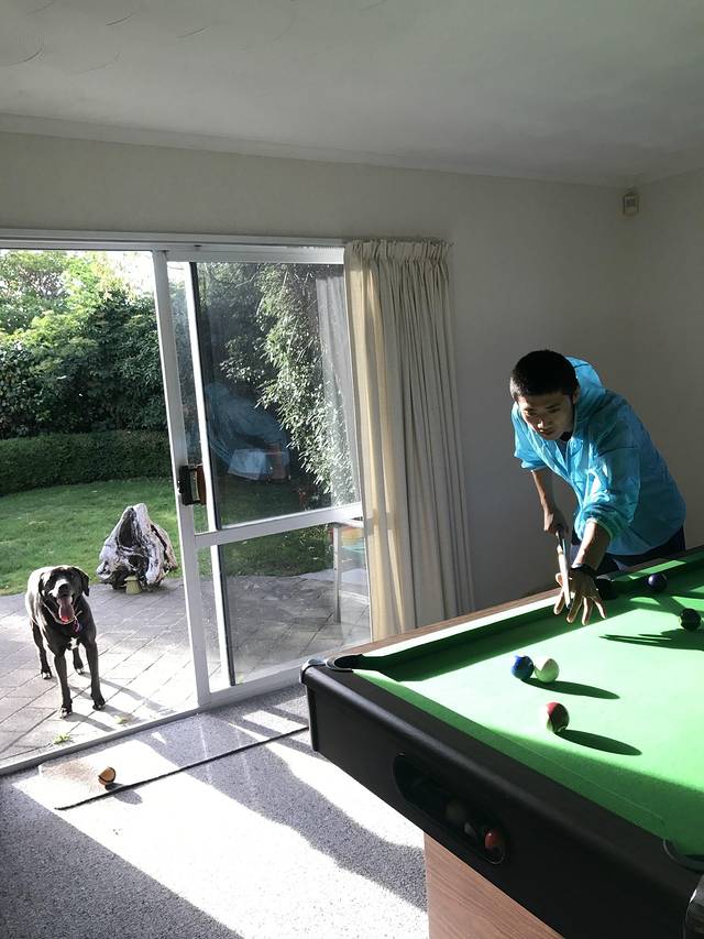 吃完饭打打台球真是再好不过了,狗狗把球叼到门里面是想让我扔球和它玩。晚上我们回房间它也要跟着,被我拒之门外,后来发现有东西落在客厅了,老公准备去拿,一开门Lucky竟然还在门口,给他吓了一跳,它真的好执着。第二天早餐我们剩了很大一块烤鸡,大部分都是骨头,给它放在它的碗里,三五下就吃完了,给它急的,吃完还到处舔了半天。