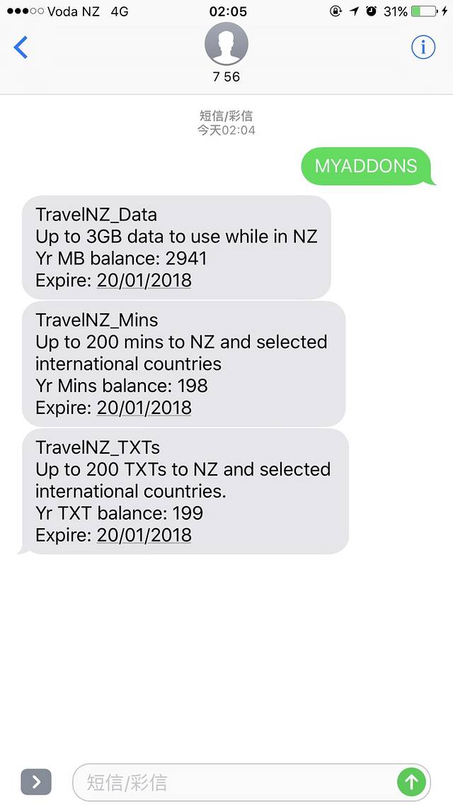 3. 查询剩余套餐流量等:在新西兰当地编辑短信MYADDONS发送至756.