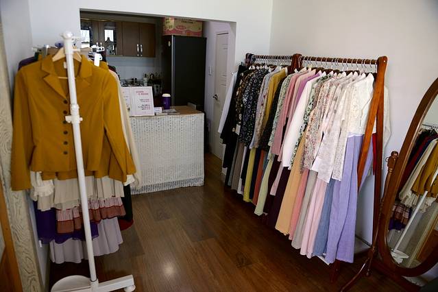 进到李章雨家屋时没穿着过去的衣服也是有点可惜的,那来这儿看看吧——摩登女孩桌。在这儿你能租借到摩登服饰和韩服。穿着平时穿不到的过去时代的衣服拍照,这在年轻人中也很有人气。