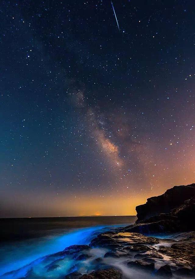 风平浪静时,只看得到星星点点的蓝眼泪。但当你用手撩拨起水花时,水面荡漾起的涟漪都是荧光蓝色,炸裂的可都是绝美的点点繁星啊,是天上银河揉碎在柔波里,沉淀着蓝色大海的传说,涌动的潮水,不断唤醒沉静的“星河”,忽而聚拢,忽而散去。“蓝眼泪”的奇观可遇不可求,每年4月到6月才有机会欣赏到这一奇妙景象。一片璀璨的星空,一岸蓝色的泪滴,星光、荧光、灯光,仿佛对应天地人。望着漫天银河,赤脚踩上细腻的沙子,脚下的荧光便一圈圈地散开了……这个初夏,我们一起去平潭看星星好不好?