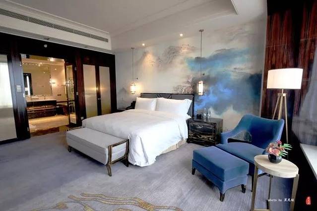 房间的风格为淡蓝色,有着欧洲的贵族宫廷风格。墙上中国风的水墨画延续这蓝调,很巧妙将西方的庄园风与中国风完美融合,配上蓝色沙发,简洁大方,明亮宽敞。空间布局合理,床上用品柔软舒服,洗漱用品也很高品质,电视可以观看网络高清电影,细节之处,可见用心打造。