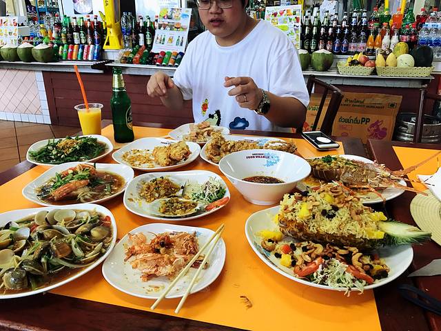 班赞海鲜市场在无数游记中被提到过,所以我们第一顿就过来了。一楼是市场,卖海鲜水果等,二楼加工吃饭。这个海鲜市场一看就是被祖国同胞玩坏了,每个摊位上都会讲中文,很溜,也很坑!价格都是瞎报报的,一定要往死里砍价!海鲜的块头都比较大,pp虾快有女孩子的手臂粗了。我们要了两个PP虾,5个老虎虾,一个龙虾,两个扇贝,开价8800铢,我差点晕了,我转身准备走,小哥马上说,给你便宜点3600铢,最后还到2000铢,送了一大盆蛤蜊。这个价格并不便宜啊,我们也就抱着尝尝鲜的心态啦!是不是觉得我们两个人点的有点多,点的时候不觉得,点完就后悔了,一份菠萝饭就够两个人吃了,太多了,剩了好多,浪费,小伙伴们酌情点哈!