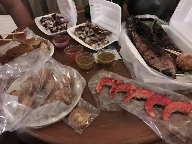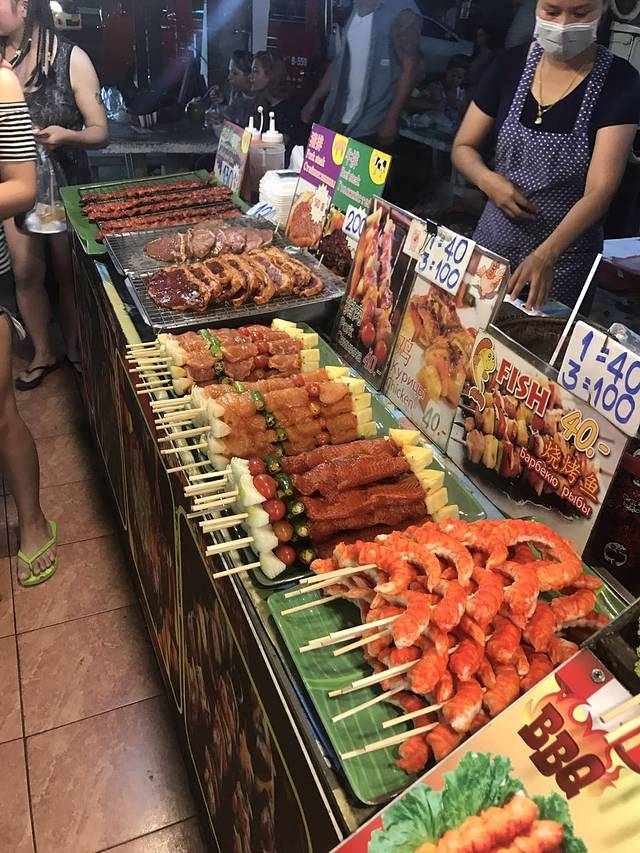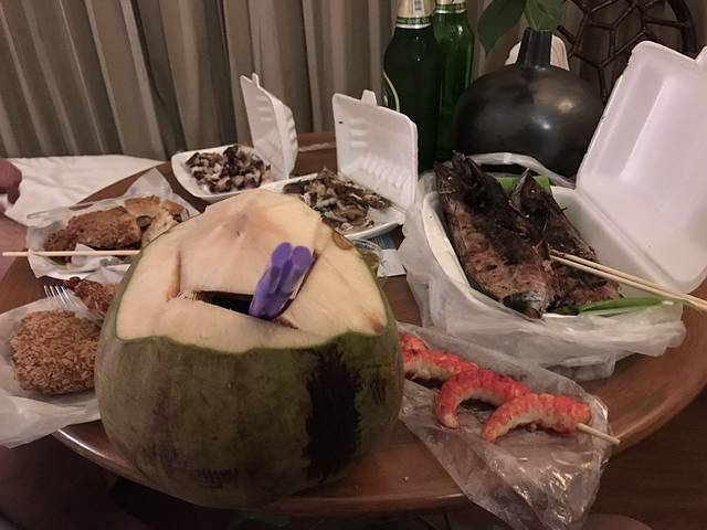 晚餐两个人100元总归能吃撑(特殊要求不算)。东西还算全,吃的嘛海鲜、烧烤、油炸食品、炒饭、炒面杂七杂八的,啥都有,还有很多水果,芒果啥的真心便宜。冰镇椰子很爽口,喝完记得让老板帮你劈开吃椰浆。