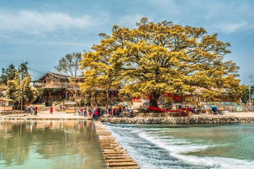 流水叮咚,一条小溪蜿蜒而过,让那座仿佛卷动时间的水车一刻不停。而那铺满鹅卵石的无数小径如同脉络一般,连接着镇里的古楼青烟,伴着四面八方充满生气的声响,汇聚而在那几株千年的大榕树面前。尽管榕树无时无刻不是处于一种静默的状态,但无论是树干上遍布的斑驳的褶皱纹路,还是其铺展在地上地下的庞大根系,都在述说这岁月的呢喃。光阴更迭,漫长的生命历程也使其见证了发生在这片土地上的兴衰荣辱,恩怨情仇,仿佛支撑起了小镇的自然心脏的颤动。无疑,在这些活“文物”面前,所有人如同沧海之一粟。而那一圈圈规律的年轮,顺次展开,能够在这个充满躁动的时代,让我们找到自己的灵魂节奏,不至于迷失。