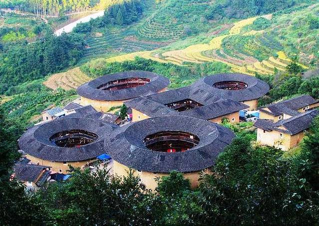 土楼之中最古老的始于元朝,而著名的有怀远楼,和贵楼,府第式土楼等,其中以怀远楼为首。走进怀远楼,便可以看到真个土楼呈双环圆状,保存得最为完整。而一看到内部结构,就不得不为这精妙的建筑工艺所拍手称赞。只见筑楼所用的木板快快层叠,尽管其因长期时间和自然力量的共同侵蚀而褪成灰暗斑驳,显得摇摇欲坠。可是事实上,正是这样的建筑结构,令它屹立千年不倒,成就一世奇观。