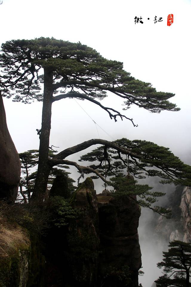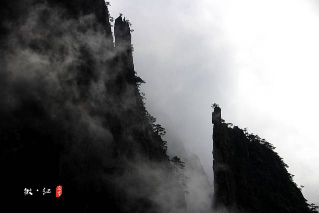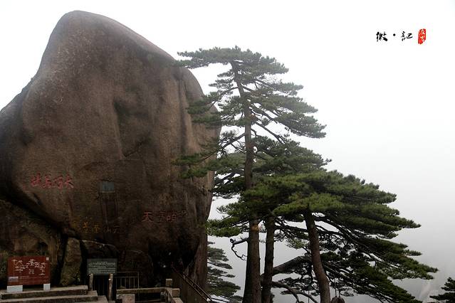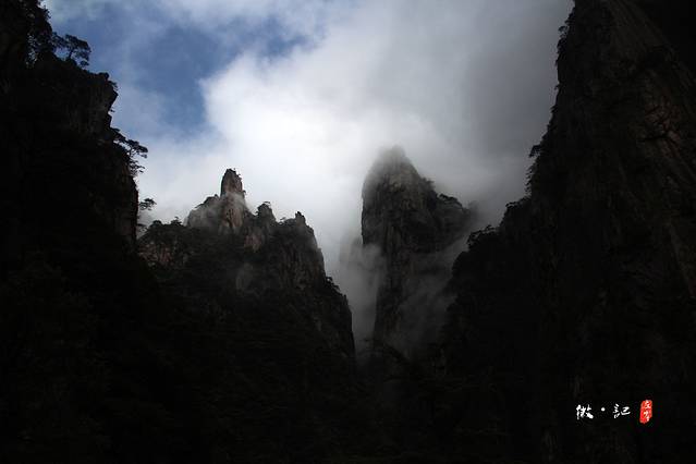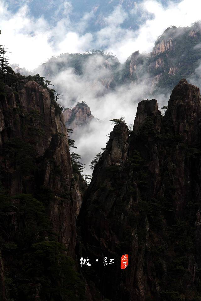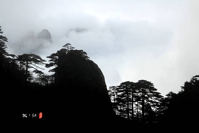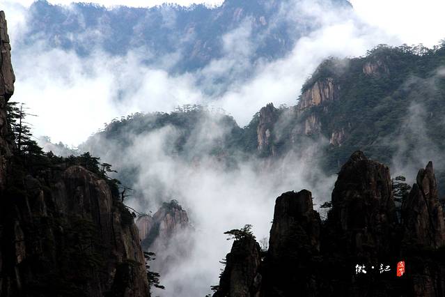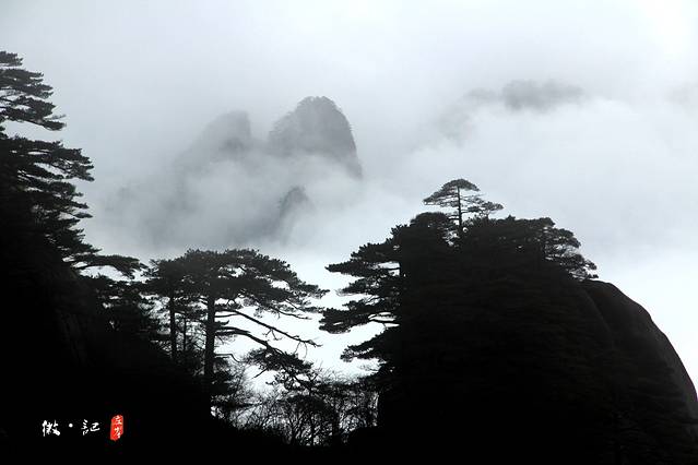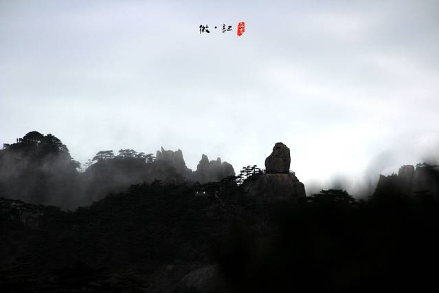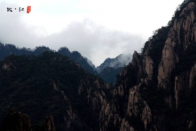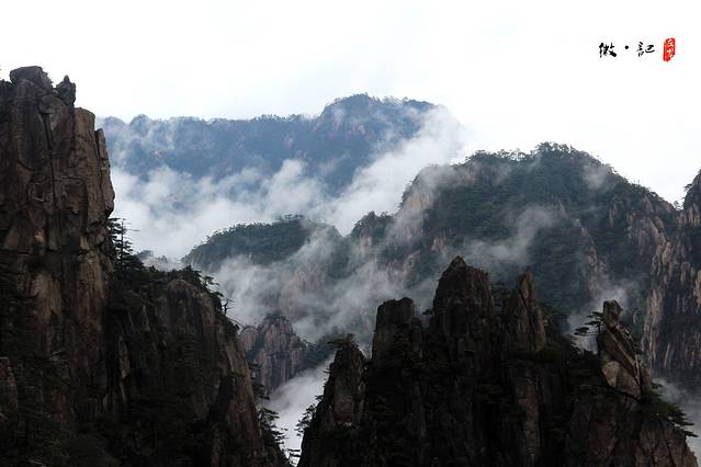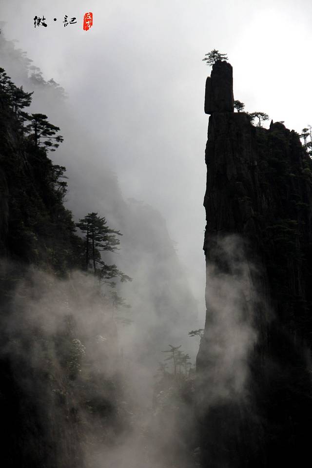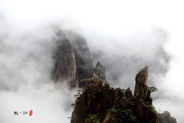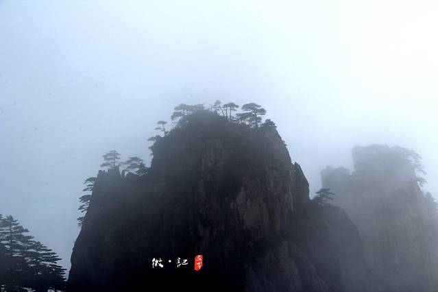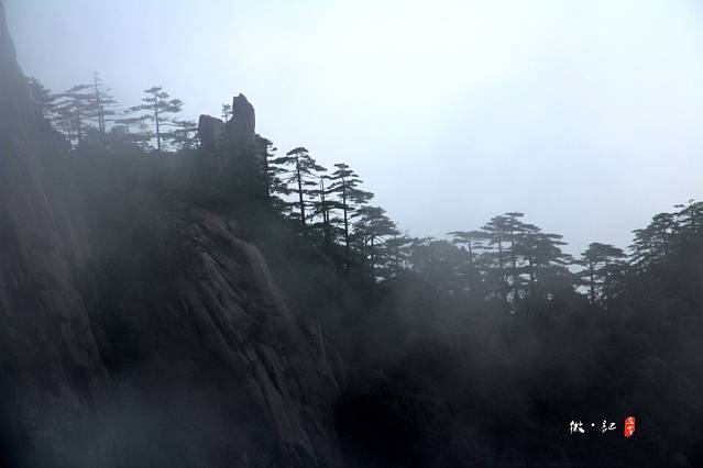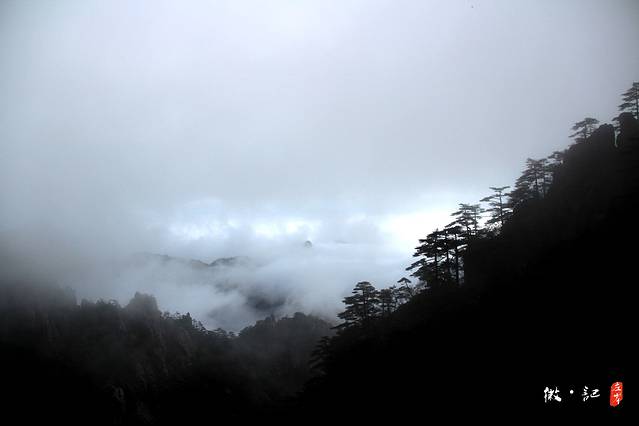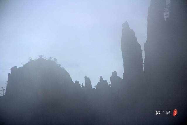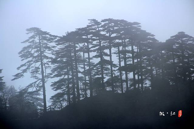 雾很大也基本拍不了照片,一切都是模模糊糊的,山岚变化很快,这会儿还有得山峰的影子,一会儿便又淹没在浓雾里了。想着总会有雾开的时候,看运气也看信心。