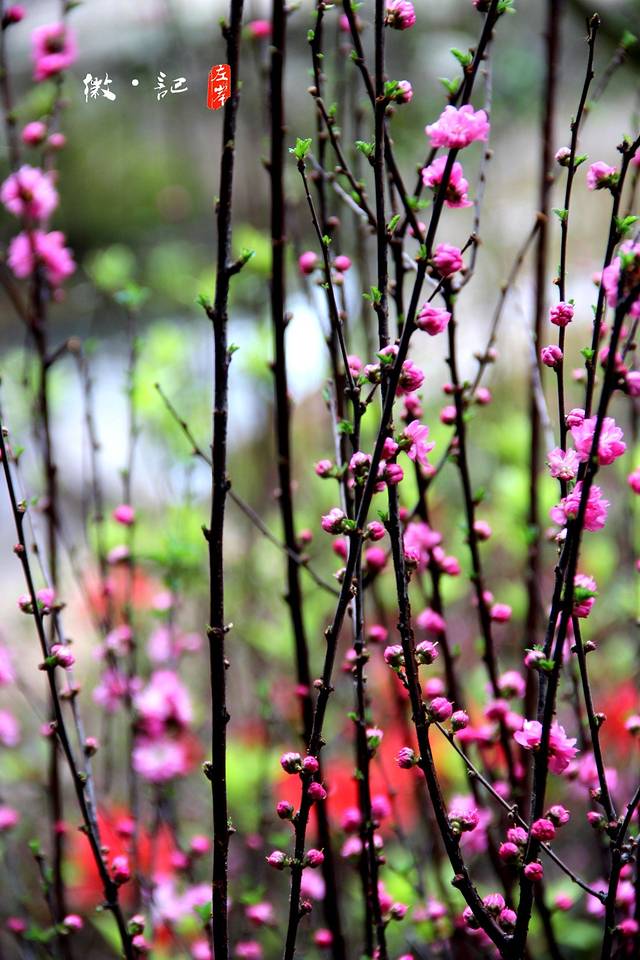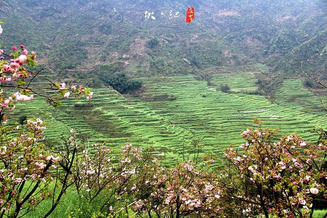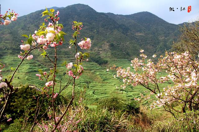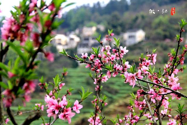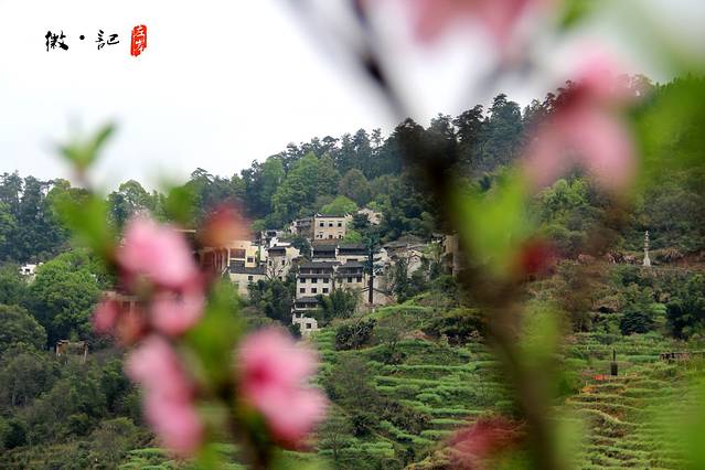 山花掩映,天街古村山居错落,青山如一弯黛眉,天街恰似眉心痣一点……
