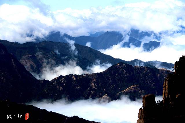 远山里白云漫漫如波涛,仿佛浪已拍到脚下。仿佛天上仙境,心胸顿时开阔,那是怎样的酣畅淋漓的愉悦,心情激动无以言表,天空开物,幻化无方。