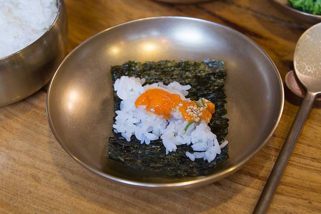 酱蟹的吃法有很多,服务员介绍的是拿一片海苔,先铺上米饭,再放上蟹黄,卷在一起放进嘴里,旁边一些当地人还会把米饭放到蟹壳里和蟹黄汤汁一起搅拌着吃。