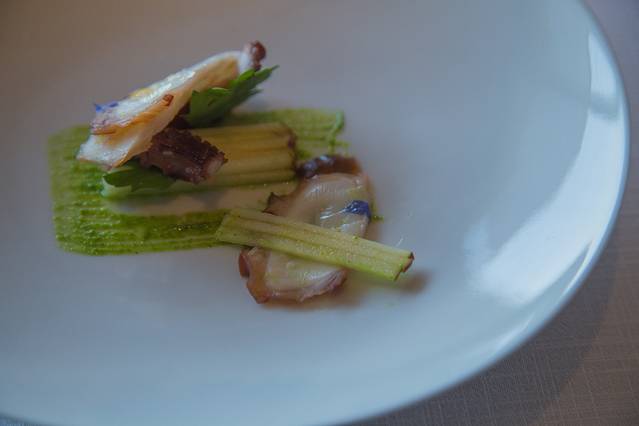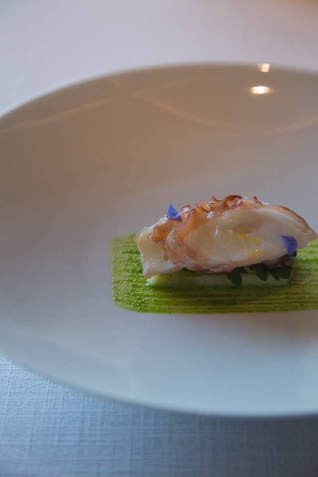 凉拌章鱼端上来就能看出是道很清新的菜,服务员介绍每片章鱼可以搭配下面的苹果丝和薄荷酱一起使用。