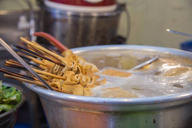 可能是食物过于糟糕,当时的注意力都集中在了附近各个摊位的阿姨们身上,仔细观察,真的是挺有意思的。每个阿姨都有自己的操作习惯,客人点餐之后就会麻利的准备好需要的食材,从身边拿一条寿司卷切断;从锅里提起两条鱼饼,取出签子放在碗里,再撒上芝麻海苔,最后淋上两勺汤,各种各样的操作做的行云流水。