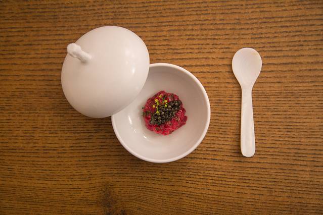生拌牛肉,白瓷餐具和犀骨勺子的陪衬下,牛肉和鱼子酱的搭配简直像一件艺术品。牛肉本身没有调味,只有咬破鱼子酱之后的一些咸味,吃起来很爽口。