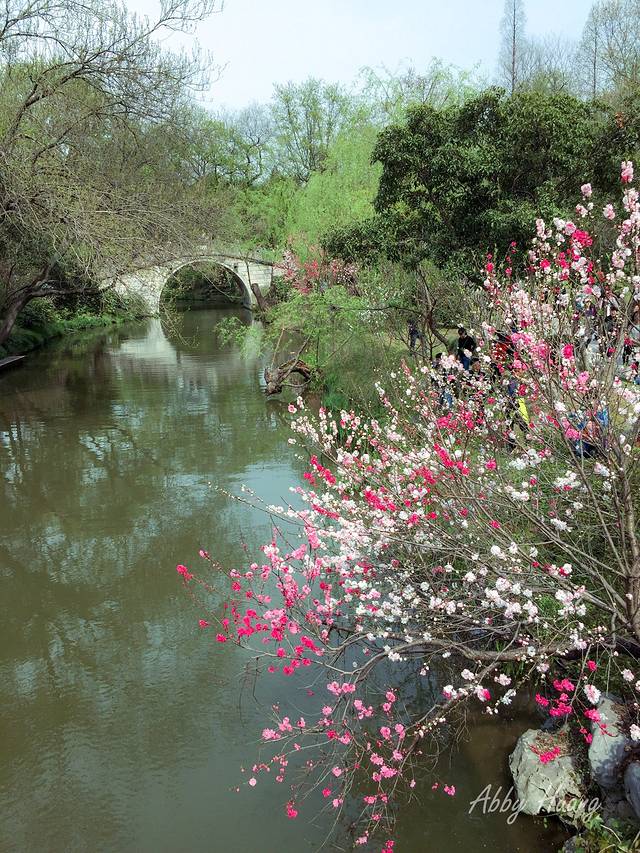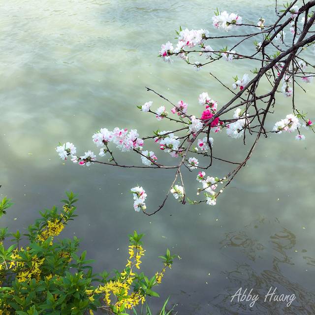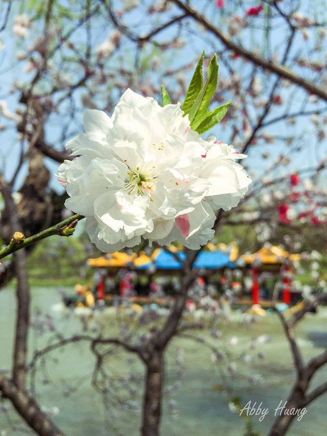 五亭桥旁便是白塔,可惜树木遮蔽拍不着,白塔后门的河道旁,又遇见一棵双色樱花,点缀着有些暗沉的河道
