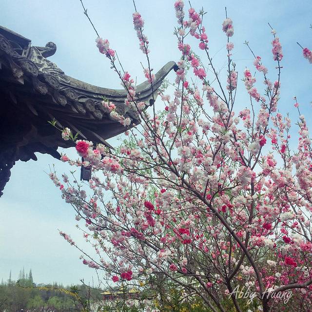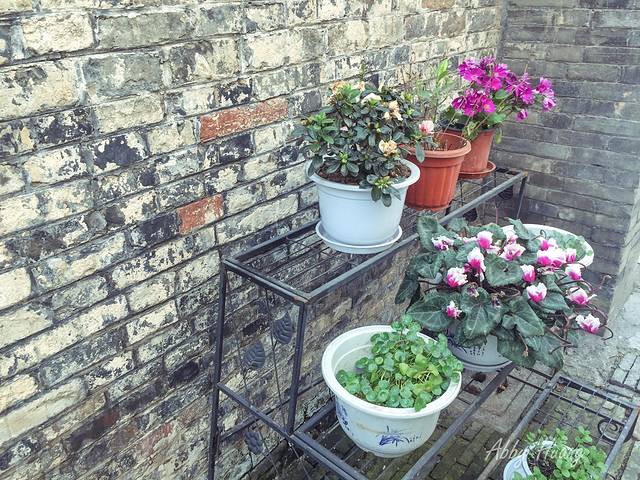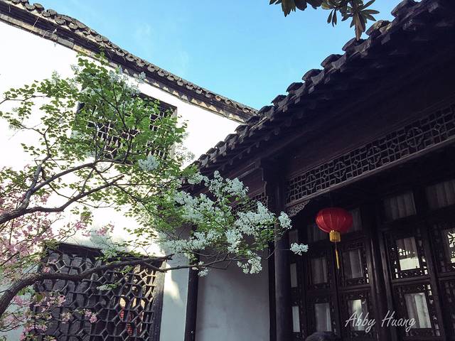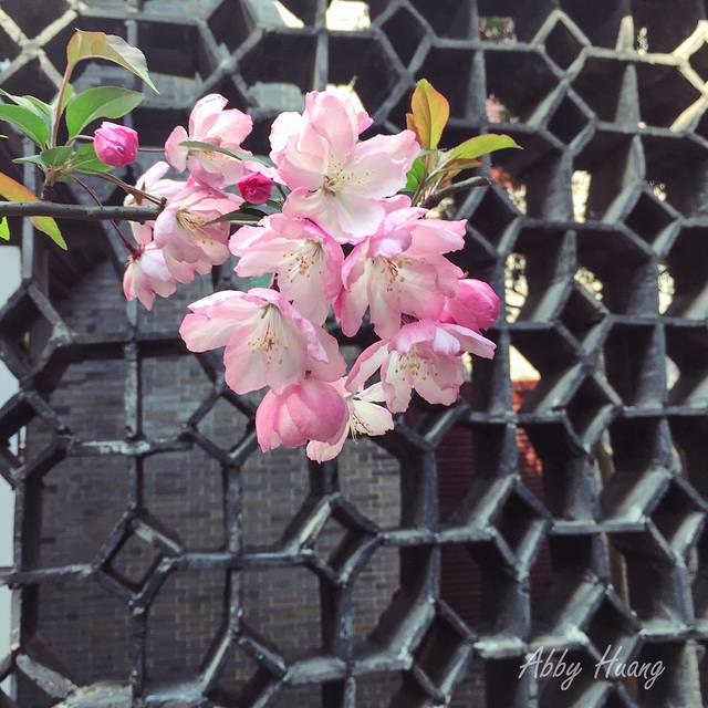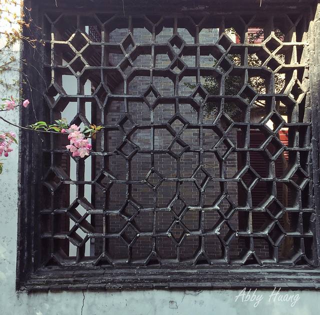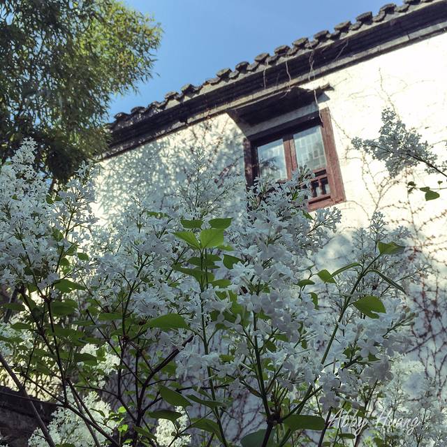开在园林里的花,看起来更加清新脱俗,一小枝一小朵,伸展在墨色的窗墙前,为老宅增添几丝生机