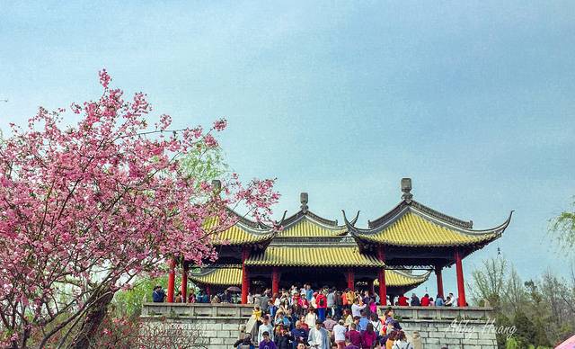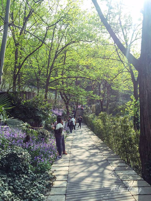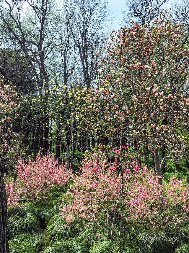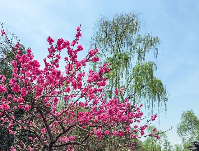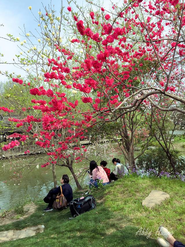从南大门入园后,便是长堤春柳,绿意盎然的柳树沿河飘逸,道路两旁各色春花竞相争艳