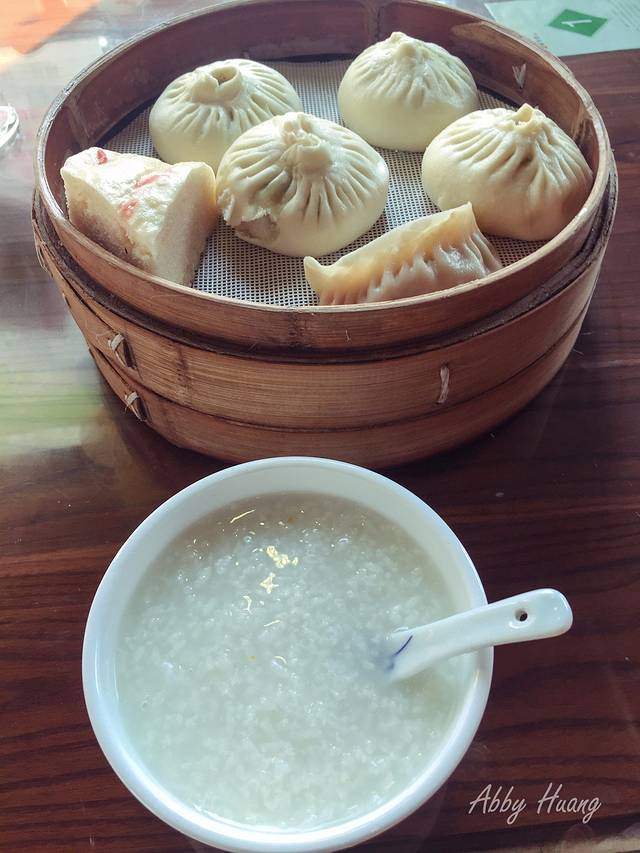 吃了块蒸饺,又吃了个梅干菜包,一碗白粥下肚,实在吃不下了。