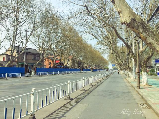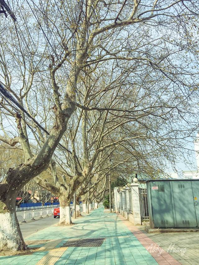 买好票在汽车站门口乘坐路公交,约5个站到达和平路站,下车后,仍需步行在这样的梧桐大道上约1公里才能到达西津渡。