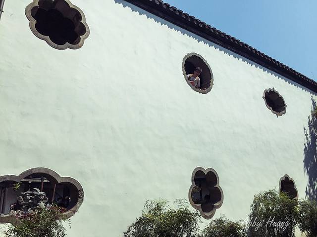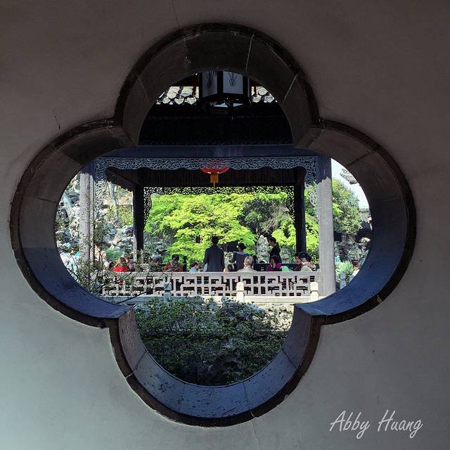 墙上一个花型开窗,窥见里面是一座精致的亭台楼阁