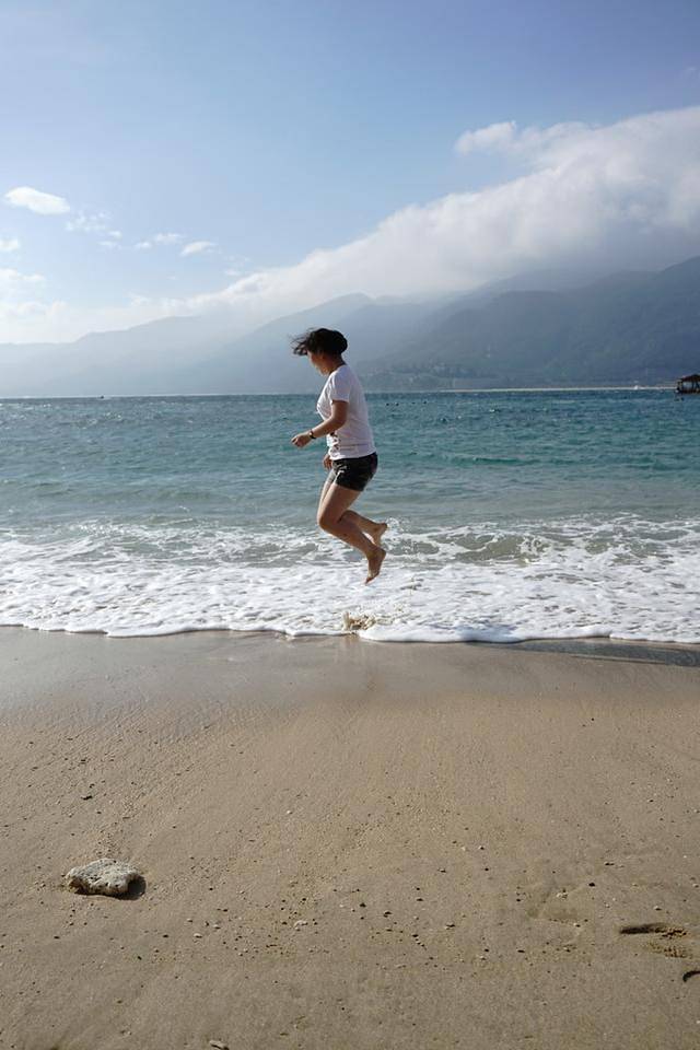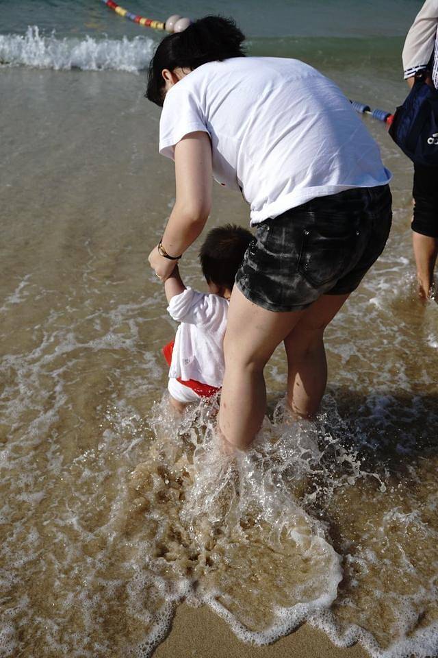 回来发现桃子不安分了,直接赤脚走在海滩上,我直接带她去踏浪,这次肯下去了,就是看到浪来拼命地往回跑,浪退就拼命地追赶,最后✋了,直接就是疯了,开始追着浪跑了,浪来就要跳起来,浪去就追,不愿离开,想一直留在大海的怀抱啊……