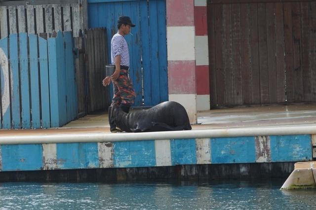最好看的是海狮表演,主持人跟我们说了如何分解海狮和海豹,好像是走路的姿势不同吧,让海狮学人走路,打招呼,转呼啦圈等,现场高潮迭起,最后还到前台和观众互动,一个幸运女儿还被海狮吃了豆腐