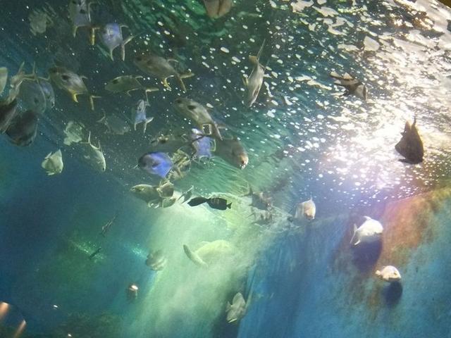 窗帘实在是太厚了,都分不清白天黑夜了!看看总是天黑,过了好久才反应过来原来把窗帘拉上了!哈哈哈哈!看下手表都已经9点多了,马上起床去我的水族馆吃早饭,因木有预约,所以挨着大鱼缸的位置只能羡慕下了,不过来的晚也挺好,可以找个靠近的位置坐,早餐是自助形式的,餐品丰富,中西合璧,包罗南北,馒头、粥、饭、面包、水果等等,不一一罗列,现在还在流口水,品种太多,导致我们天天都吃得好饱,桃子也吃的很是开心,天天都是一碗粥!吃完了带桃子去看看海龟、魔鬼鱼、其他不认识就直接统称海鱼!