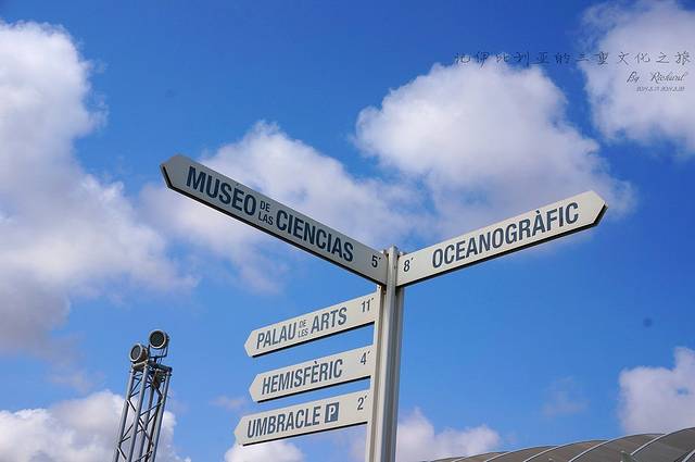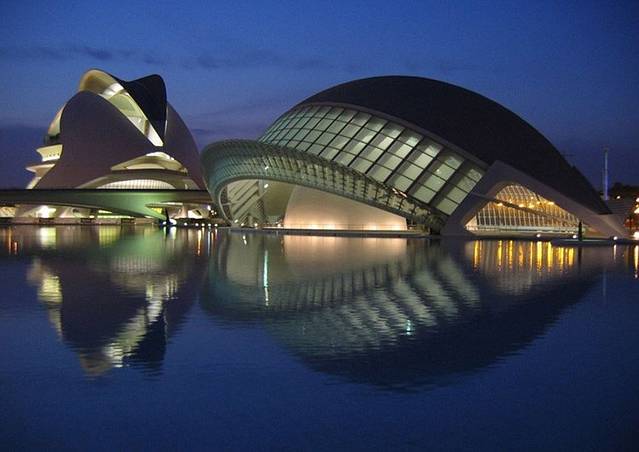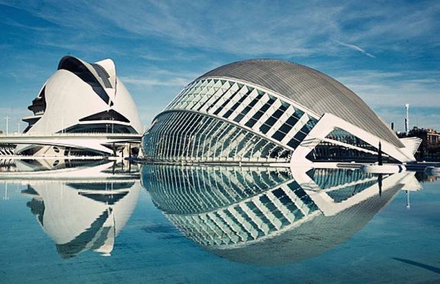 瓦伦西亚艺术和科技新城的五座现代场馆包括艺术馆、海洋馆、美术馆、科学馆、电影馆,形成这里的标志性建筑。