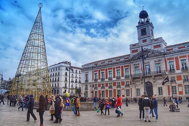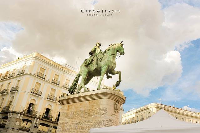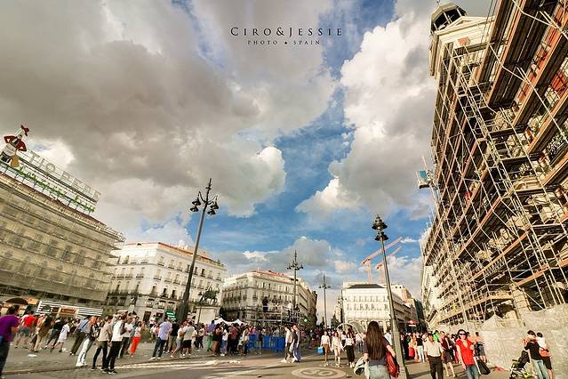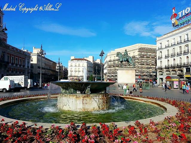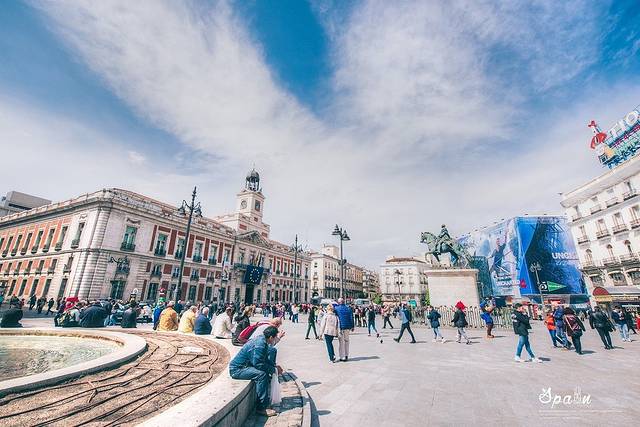 太阳门广场是马德里的中心。最初太阳门广场旁有一个太阳门,它曾经是马德里的东大门,历时一个世纪之久。因为它面向太阳升起的东方,所以取名为太阳门。广场中央有一个熊和野杨梅树的雕像。每一个来到马德里的游客都会在太阳门广场与熊和野杨梅树的雕像合影留念。关于马德里的名字来源,有这样一个传说:很久一个小孩遇到了一只棕熊,他撒腿就跑爬到了附近的一棵大树上,刚喘口气便听到妈妈找他的呼唤声。担心妈妈受伤害的小男孩大声呼喊:“妈妈快跑!妈妈快跑!”。在西班牙语中马德里写作Madird,可以拆分为Madre和id 两个词,Madre 是母亲,id 在古代西班牙语中是跑、走、离开的意思,也因此马德里的原意就是“妈妈快跑”的意思。时至今日,广场中央还有两个设计比较简单的椭圆形花坛,熊和树莓。
