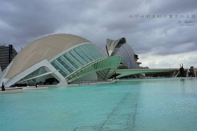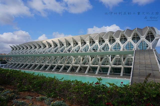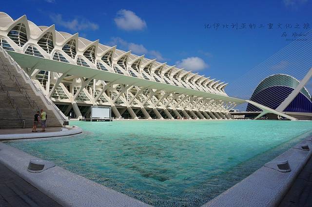 近处的建筑为天文馆,天文馆的水体在烈日下显得格外清澈。其身后的建筑则是索菲娅王后艺术歌剧院,这座剧院能同时容纳4000名观众。这座白色的歌剧院好似张着嘴的鱼,随时会跃出水面。由于造型前卫,这座建筑曾一度成为瓦伦西亚现代化的象征。