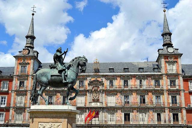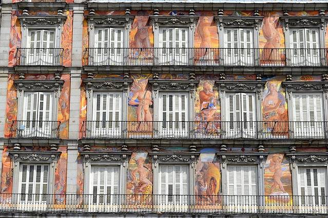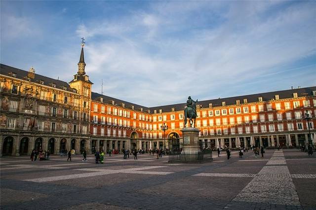 西班牙每一座城市,几乎都有一个马约尔广场(Plaza Mayor),其实在西班牙语里,Plaza Mayor 被翻译为大广场。广场中有咖啡馆、商店等各种设施。马德里的马约尔广场始建于1620 年,正是哈布斯堡王朝最辉煌的时代。近百年来,广场都是举办集市和戏剧表演的所在地,如斗牛表演,足球比赛和公共展览等。现如今,有好多文艺的年轻人来到此地写生,进行艺术创作,各种庆典活动、街头艺术家常聚集于此。如果你想和朋友碰头最好约在这里,因为任何一条游览马德里路线的起点都可以从这里开始。广场之恢宏,很大程度上归功于暖色调并配有237个铁阳台的色公寓,有着精美壁画装饰的17 世纪皇家糕点厂(RealCasa de la Panadería)也不可不看。