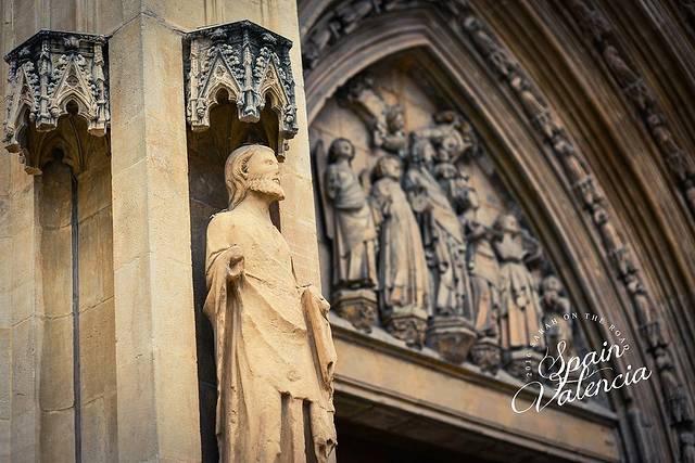 瓦伦西亚大教堂,三个门有三种不同风格,新罗马式的正门、巴洛克式的南侧宫门(也是最古老的大门),还有西哥特式的北侧使徒门。