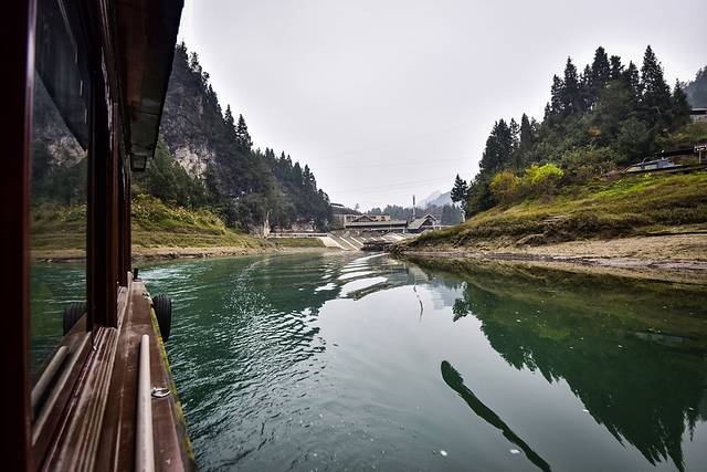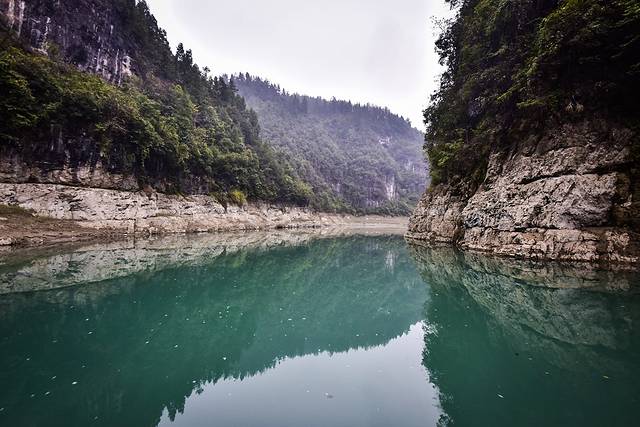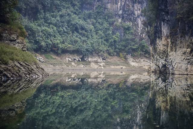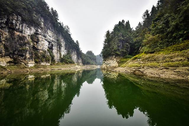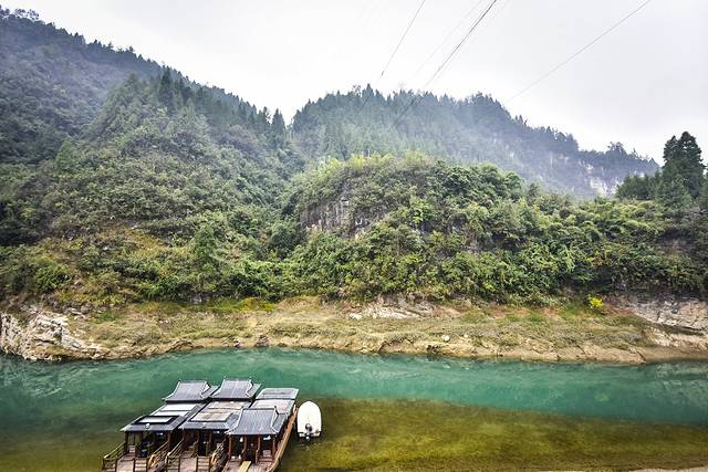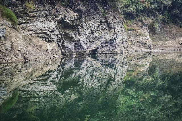 早上吃完早餐兴致勃勃的前往清溪峡游船码头乘坐一艘极具诗情画意般的画舫慢悠悠的向水里更深处漫溯,此时此刻的山野君已经快成为诗人了。面对清澈的像一面镜子一样的清溪峡河水真的让我为此着迷。在这样阴雨天气之下居然能够看得到山的倒影,而且是这些倒影不像是在水中形成的倒影而是光滑的镜面反射而出的影像,真的很神奇、很震撼!