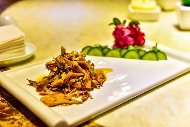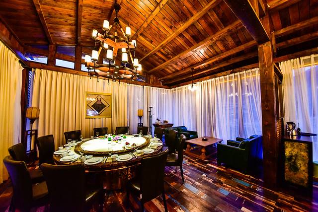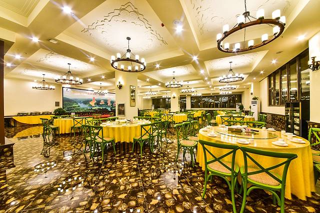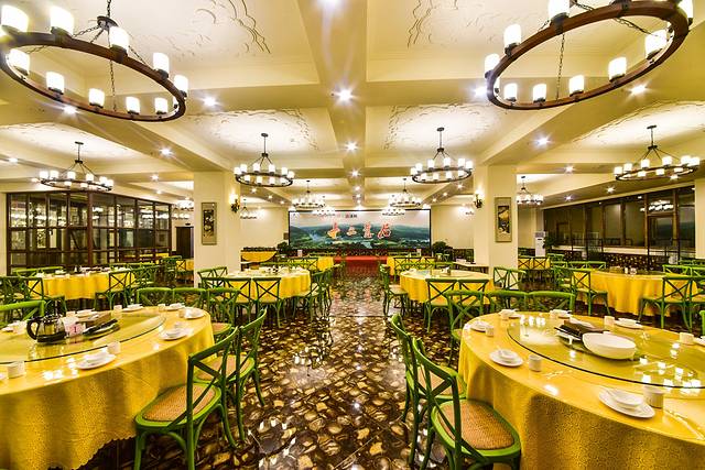 餐厅的规模很大,可以供上百人一次性就餐服务。与整个山庄的大厅是同为一体的,非常的有气势。餐厅的整体环境给我的印象那就是雍容华贵的装饰与高贵大气的色调给人一种非常小资且高大上的整体格局。